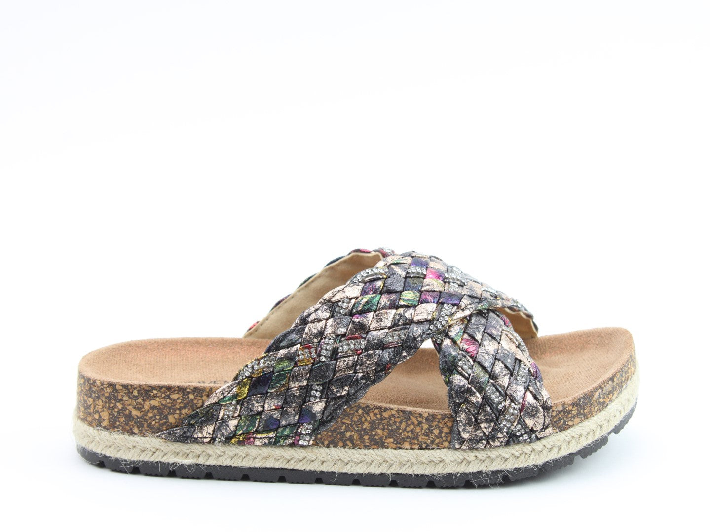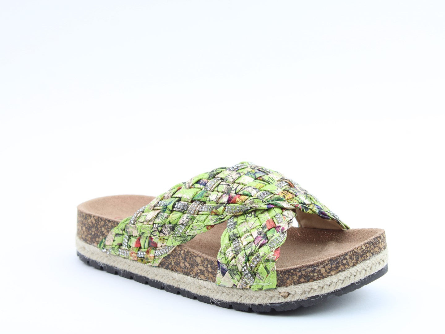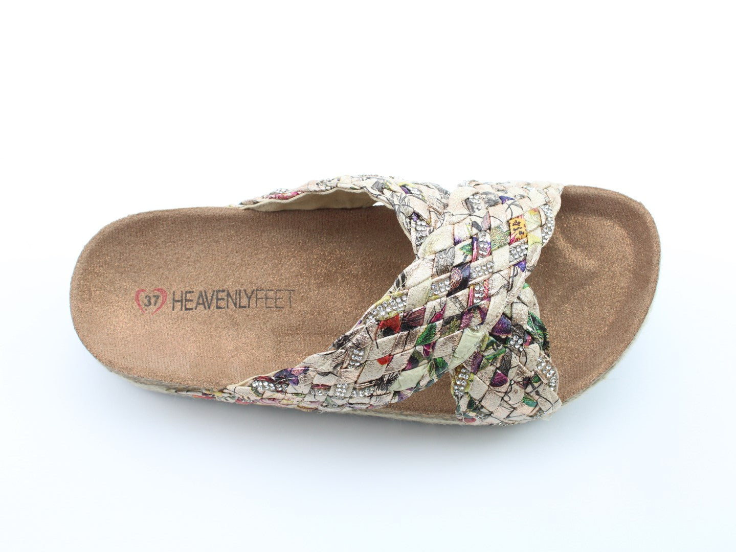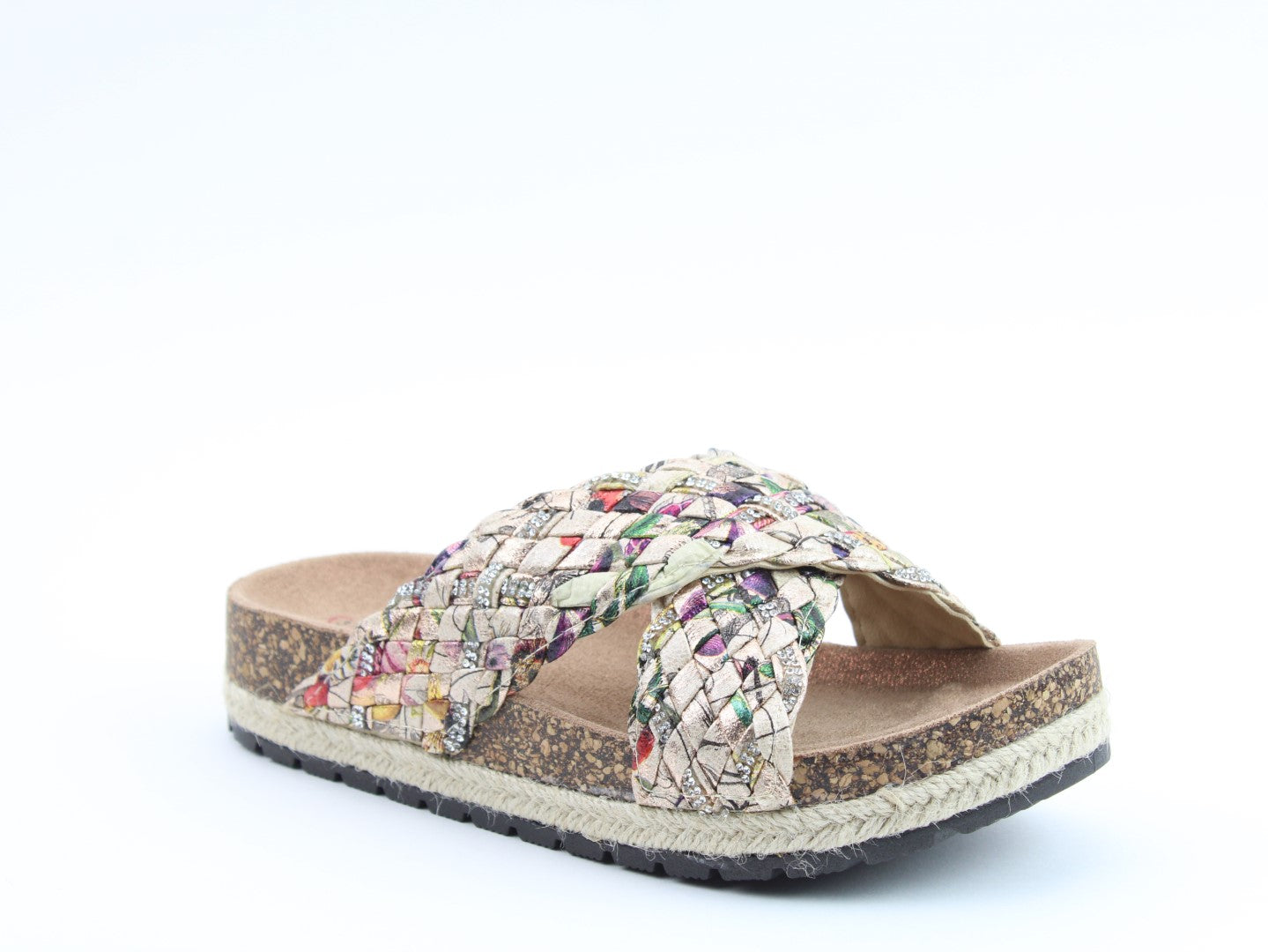 Step into comfort and style with the Erin bio-sandal. The soft patterned upper offer a little glitz and glamour via the inter-woven diamante jewels, whilst the cork-inspired outsole with jute surround provides a blend of casual elegance and everyday wear-ability. Ideal for warm-weather outings, Erin delivers breathable comfort and a soft contoured foot-bed for all day support.