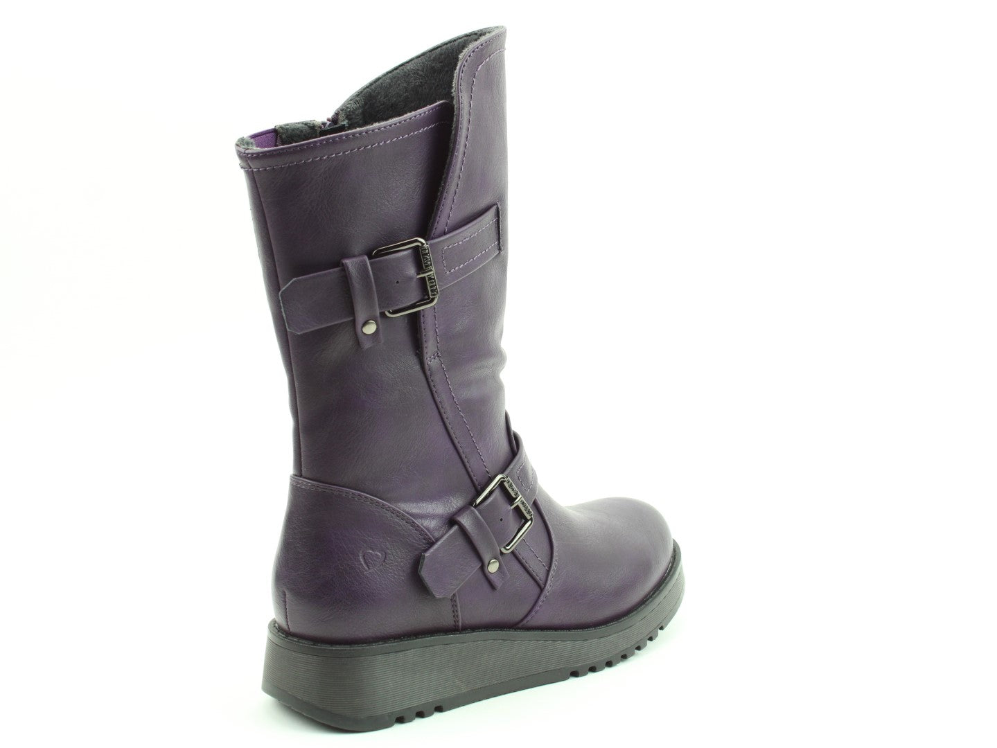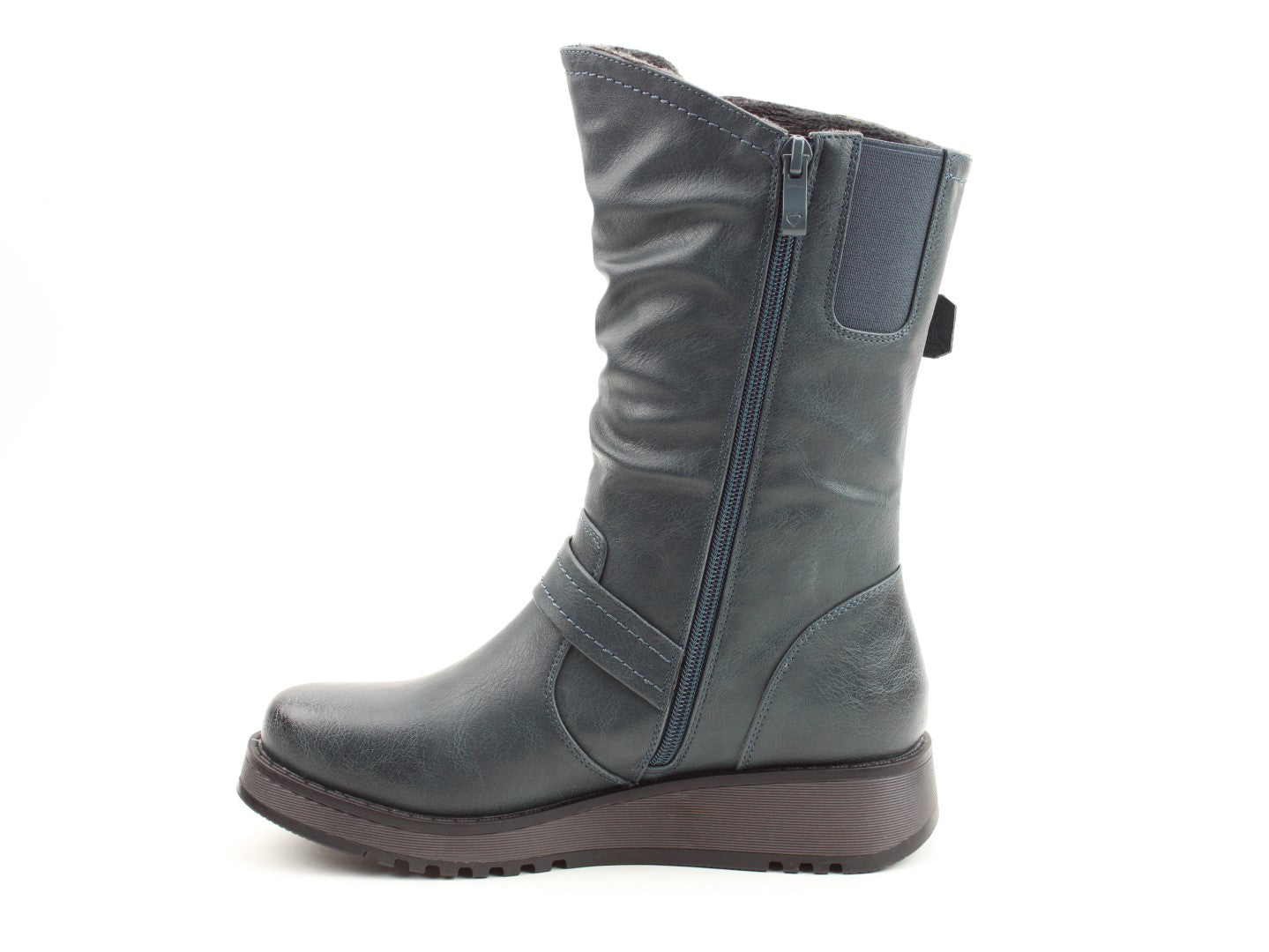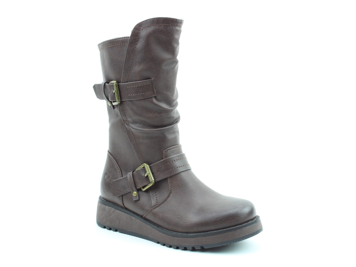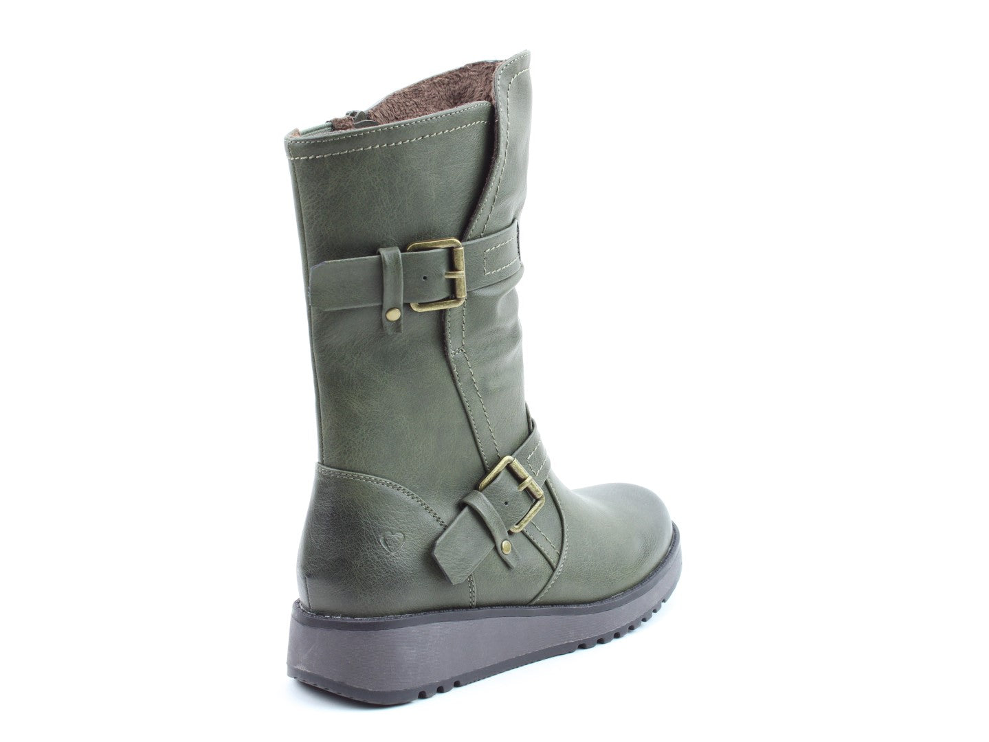 Ladies relaxed casual mid-calf Vegan friendly boot. Features a soft man-made upper with twin adjustable buckle fastening straps and colour matched outsole.  Soft textile lining and our new textile covered removable Memory Foam foot bed for supreme underfoot comfort.  A full length side zip and elastic top panel allow for ease of fitting. Hard-wearing low wedge outsole with our heart design.