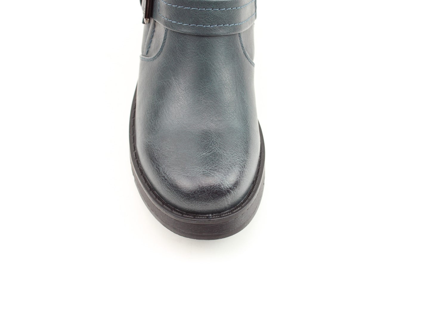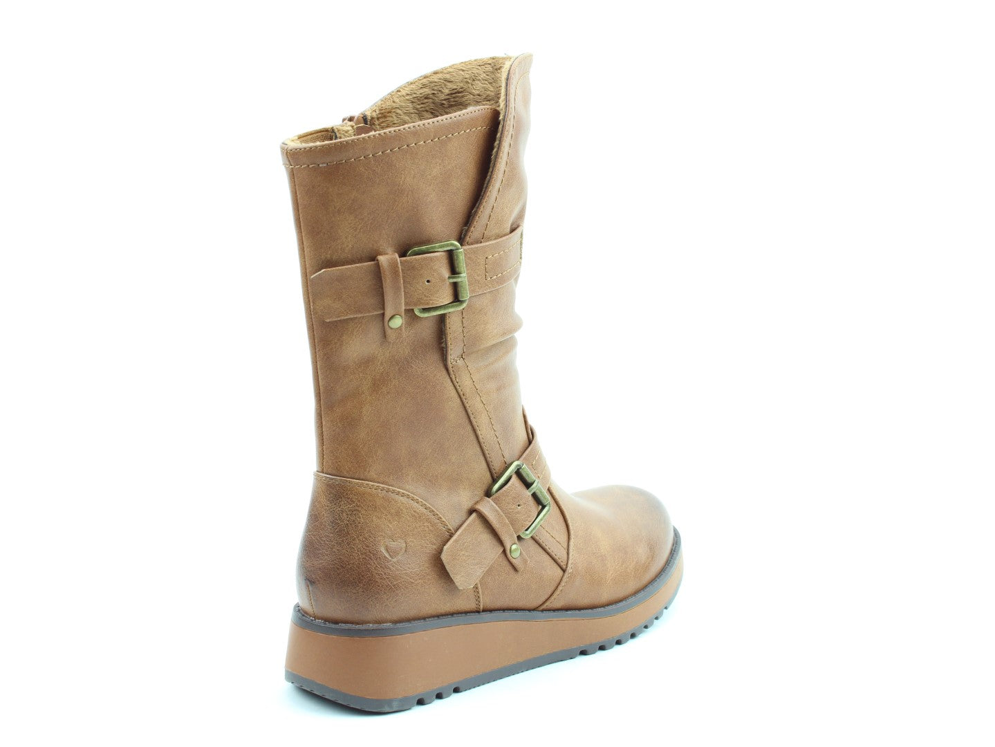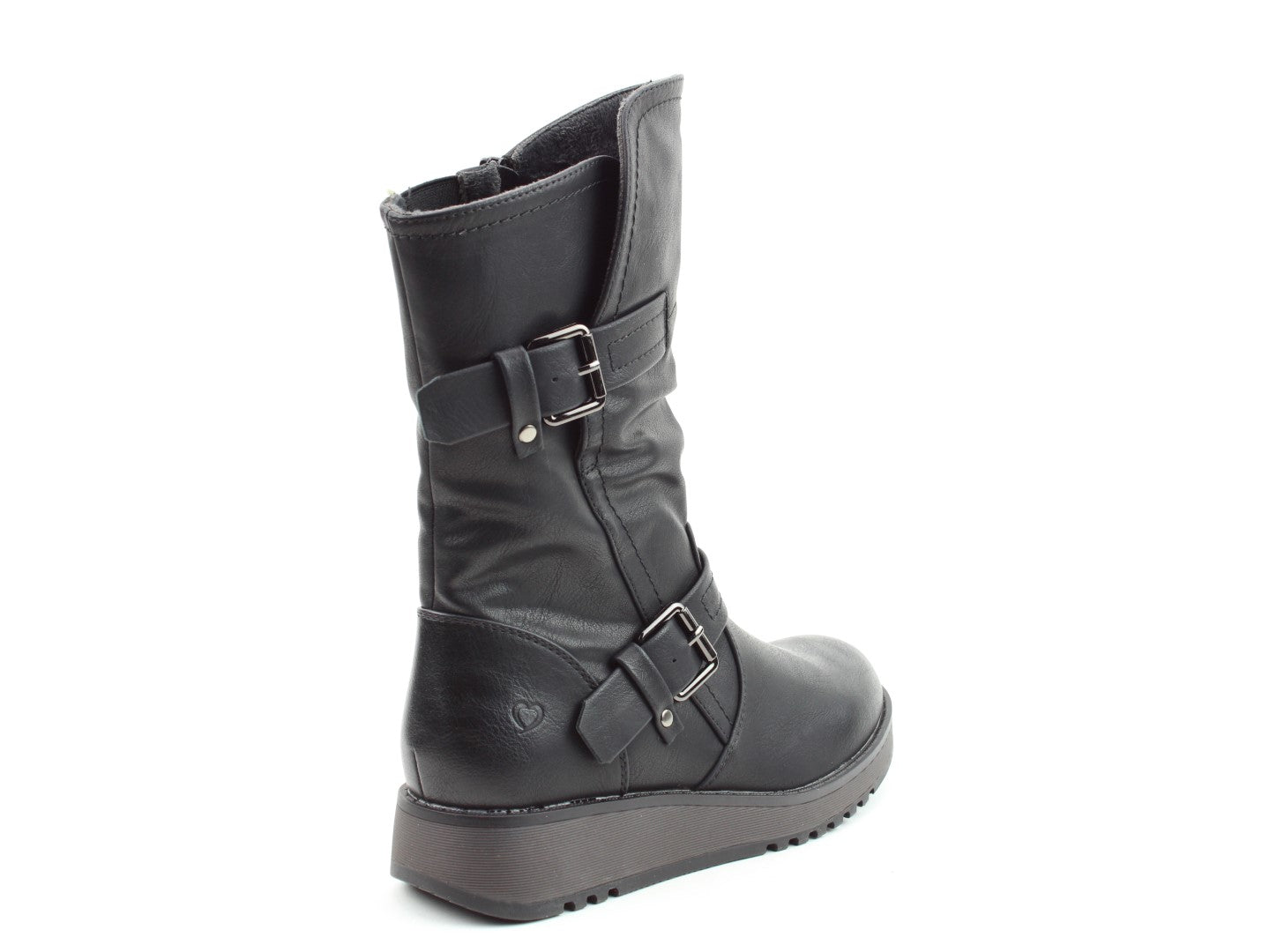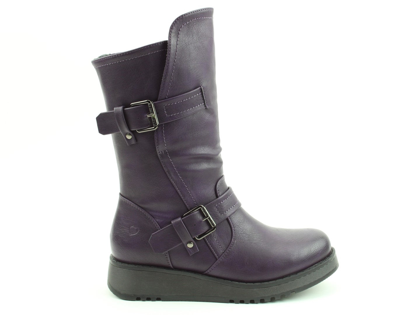 Ladies relaxed casual mid-calf Vegan friendly boot. Features a soft man-made upper with twin adjustable buckle fastening straps and colour matched outsole.  Soft textile lining and our new textile covered removable Memory Foam foot bed for supreme underfoot comfort.  A full length side zip and elastic top panel allow for ease of fitting. Hard-wearing low wedge outsole with our heart design.