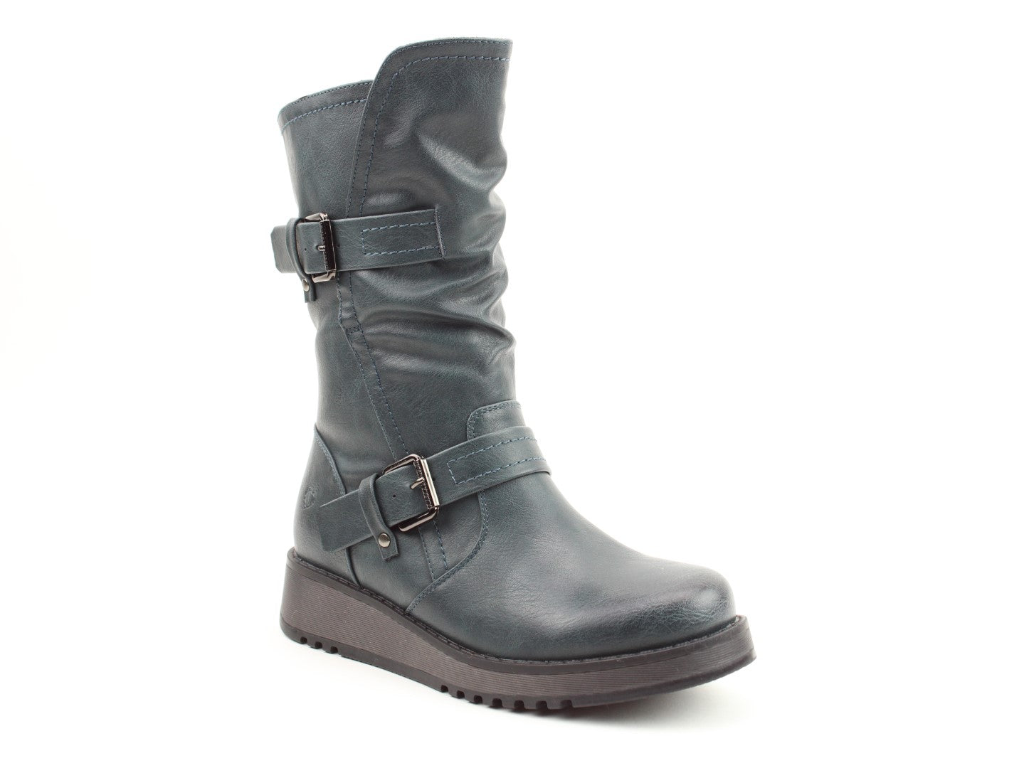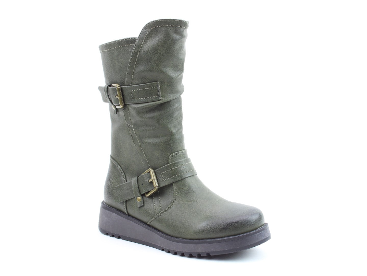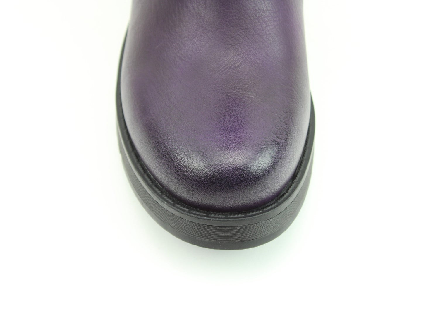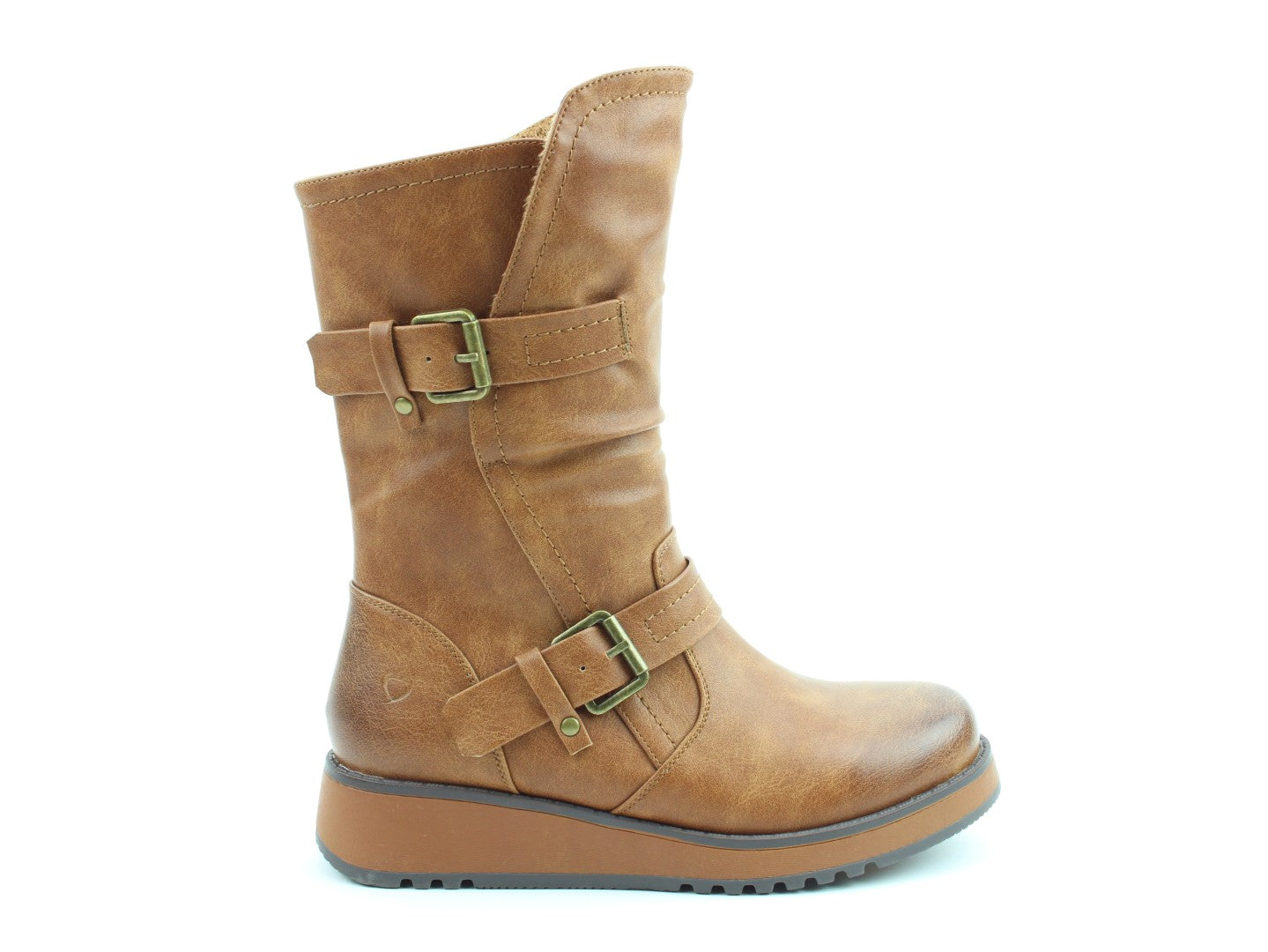 Ladies relaxed casual mid-calf Vegan friendly boot. Features a soft man-made upper with twin adjustable buckle fastening straps and colour matched outsole.  Soft textile lining and our new textile covered removable Memory Foam foot bed for supreme underfoot comfort.  A full length side zip and elastic top panel allow for ease of fitting. Hard-wearing low wedge outsole with our heart design.