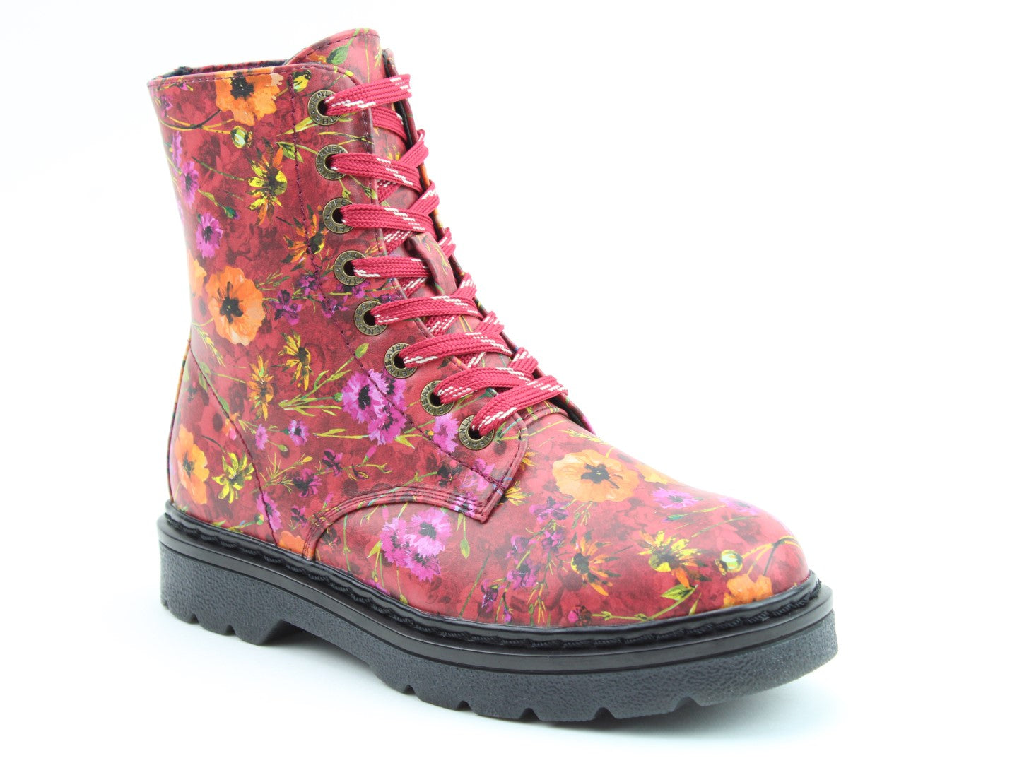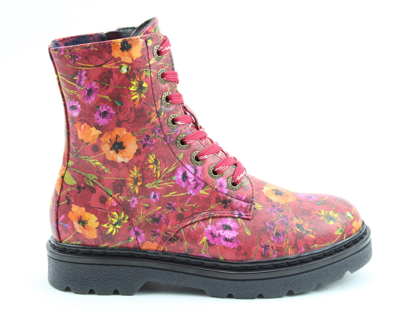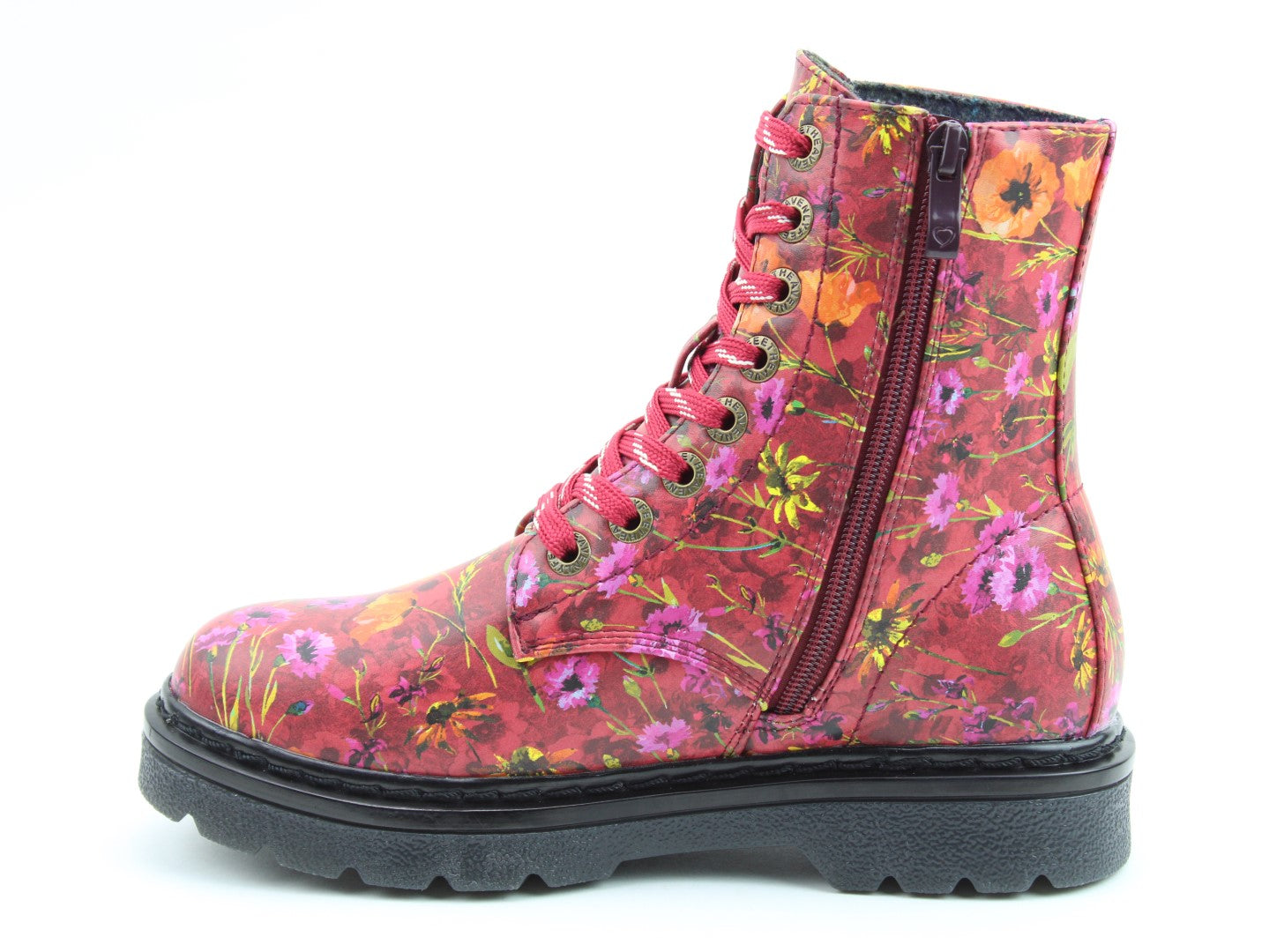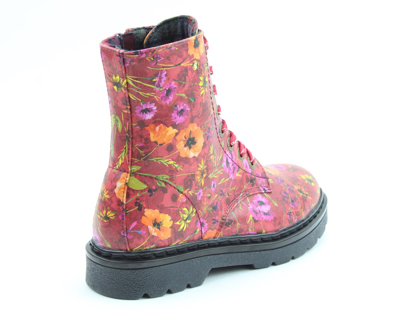 Part of our exciting Justina2 range, new pattern print Poppy adds some real panache to this fabulous style. This vegan friendly boot has an easy wipe clean upper, with a striking poppy print floral pattern, making this style the ideal boot to wear with a wide range of outfits this season. With an 8- eyelet lace and the addition of a full length side zip this boot offers great support and easy on/off the foot fitting. Comfort is a given with our innovative removable memory-foam comfort inner-soles and super soft plush linings. This is a sure fire statement boot and is at home with edgy fashion as paired over jeans/leggings or with a skirt.