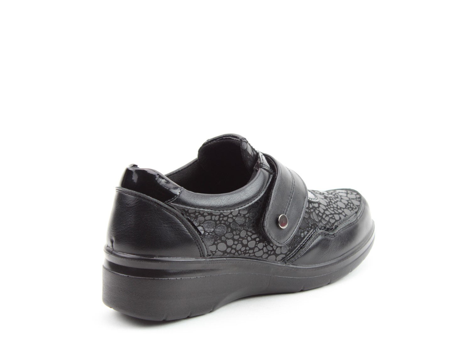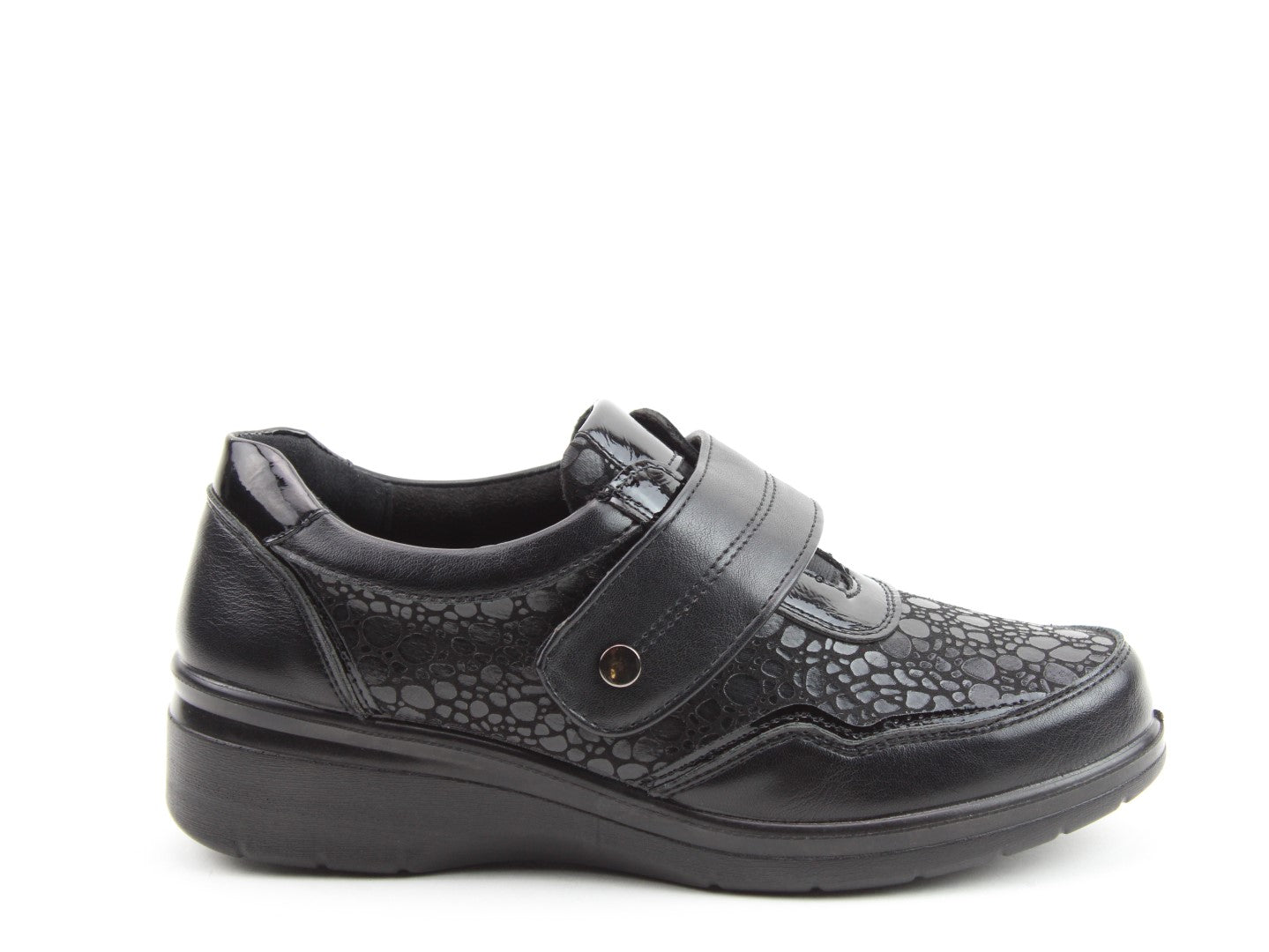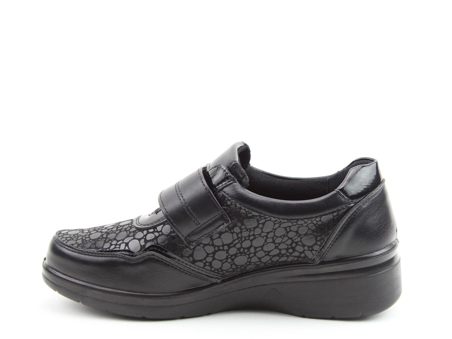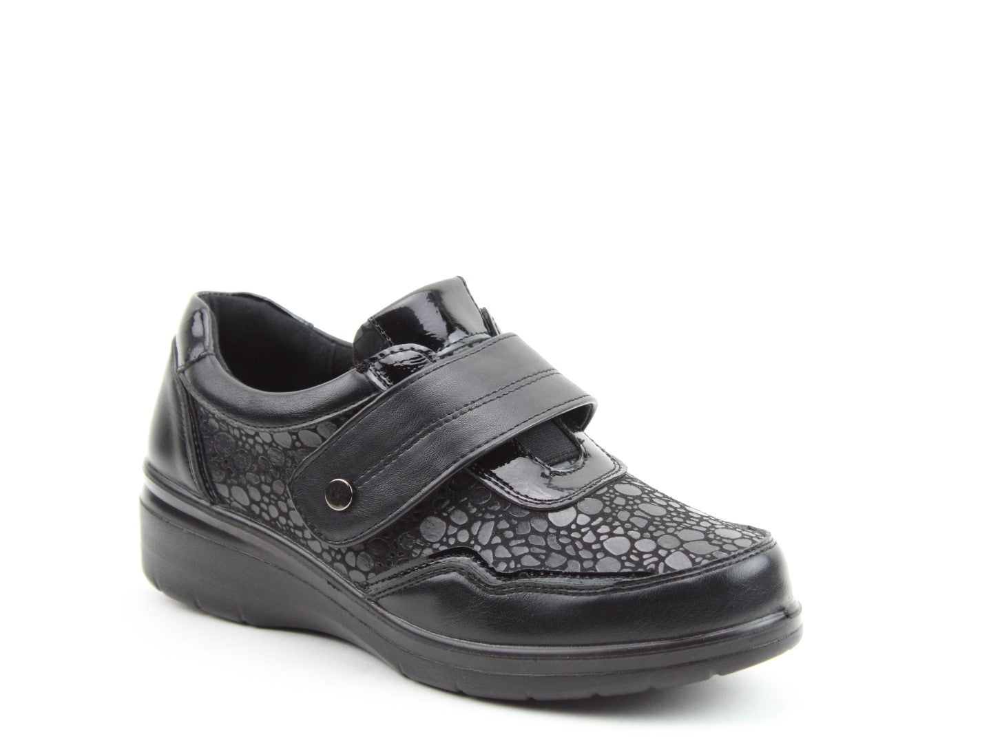 New this season is this vegan friendly ladies slip-on shoe Malaga. With a soft wipe-clean upper featuring a patterned finish and patent accents, this shoes will be perfect to accompany a wide range of outfits. The addition of a Velcro style touch-fastening strap across the shoe alongside a soft textile lining and removable comfort insole, this shoe is super comfortable and oh so practical. The shoe is so lightweight you'll forget you're wearing them!