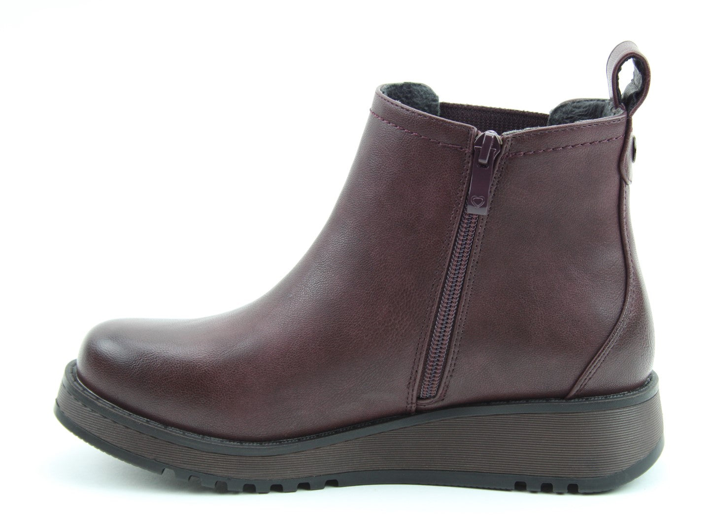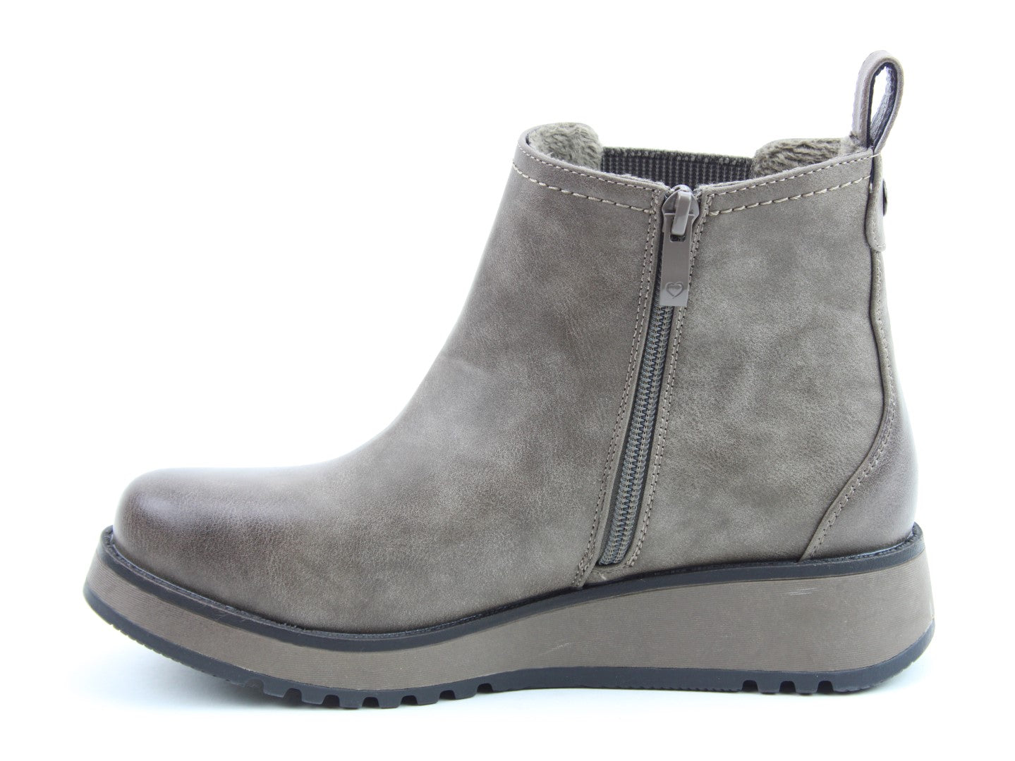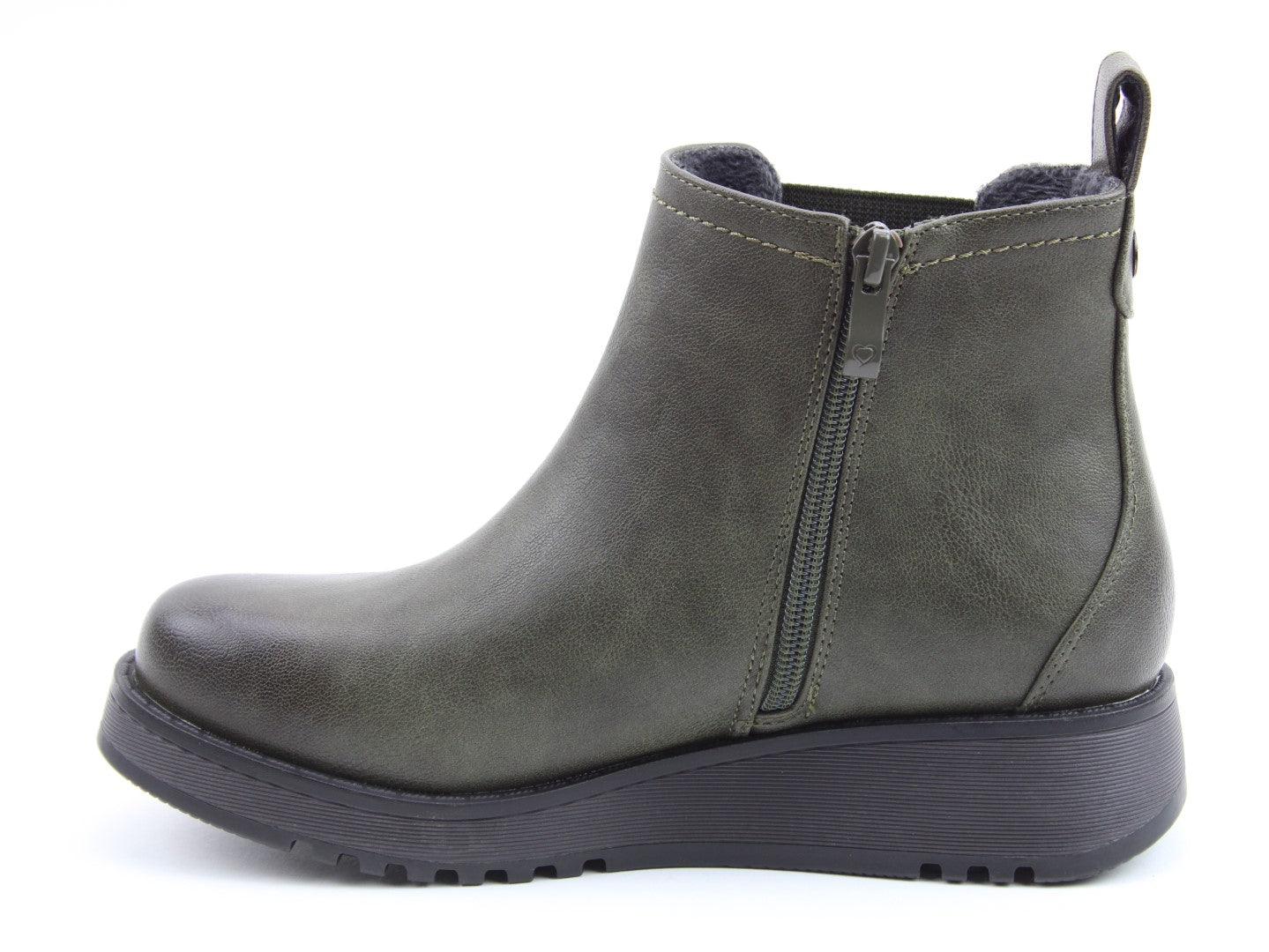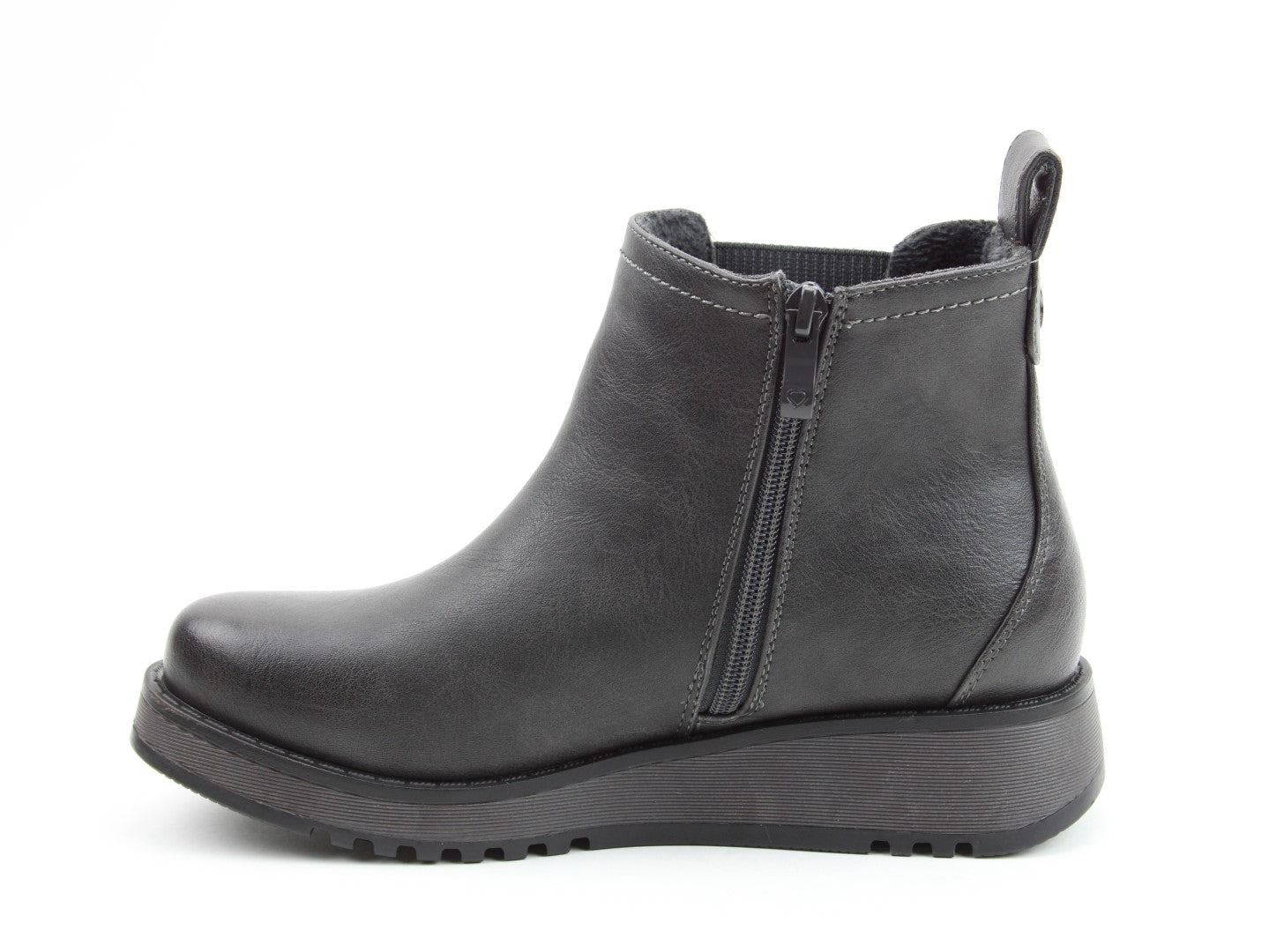 Our best-selling ladies casual everyday ankle boot now features a stylish new outsole design.  Soft Vegan Friendly man-made upper, comfort lining and removable foot-bed with textile covered Memory Foam for supreme underfoot comfort. Full length side zip. Also features a stretch elastic panel for extra comfort and fitting plus a finger-pull tab at the heel.